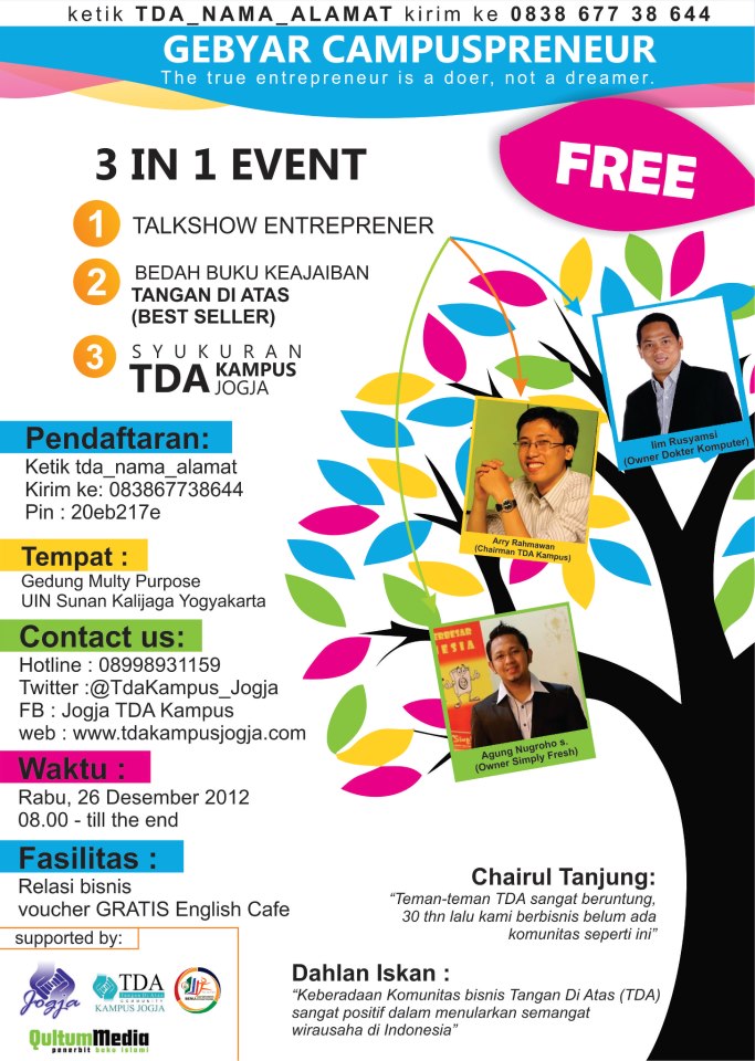 Rabu, 26 Desember 2012 adalah sebuah hari yang bersejarah untuk TDA Kampus Jogja. Karena pada hari inilah komunitas wirausaha mahasiswa ini secara resmi dilaunching dalam sebuah event bernama Gebyar Campuspreneur.